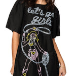 Black cotton dress with “Let’s Go Girls” lassoing cowgirl graphic
