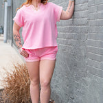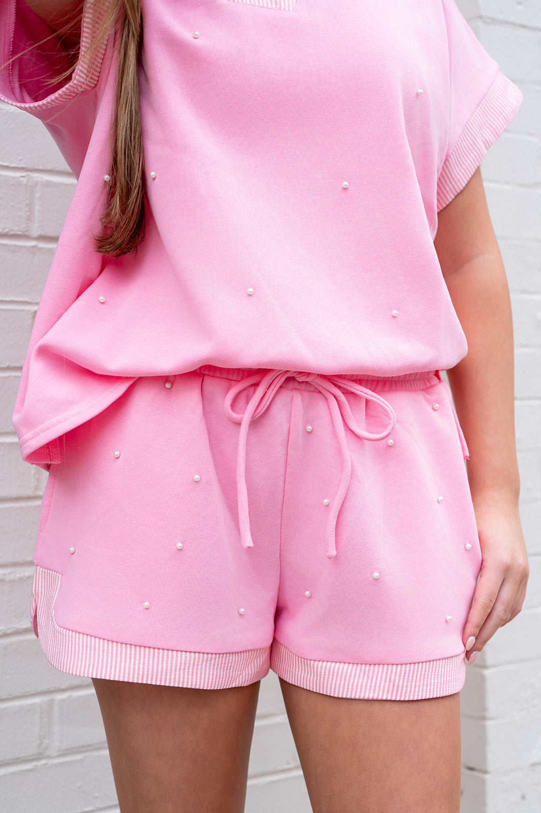 The Light Pink Pearl Stud French Terry Dolphin Shorts blend cozy comfort with elevated detail. Designed in a soft light pink French terry fabric, these lounge-inspired shorts feature delicate pearl stud accents scattered throughout for a feminine, polished touch.