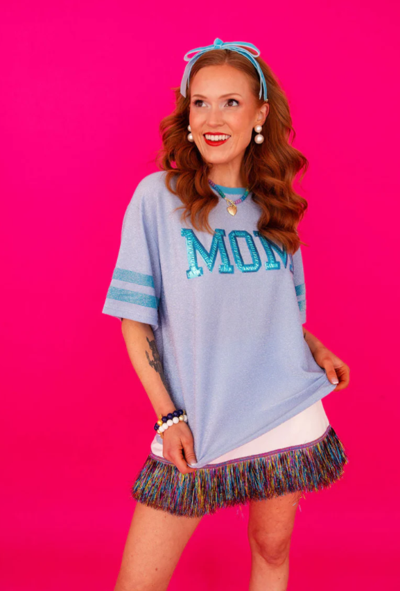 Celebrate mom life in sparkle with the MOM Blue Sparkle Tee by Brianna Cannon. Featuring bold “MOM” lettering accented with shimmering sparkle detail, this tee combines everyday comfort with signature Brianna Cannon glam.