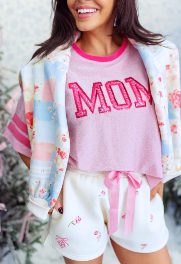 Pink tee with sparkle “MOM” lettering