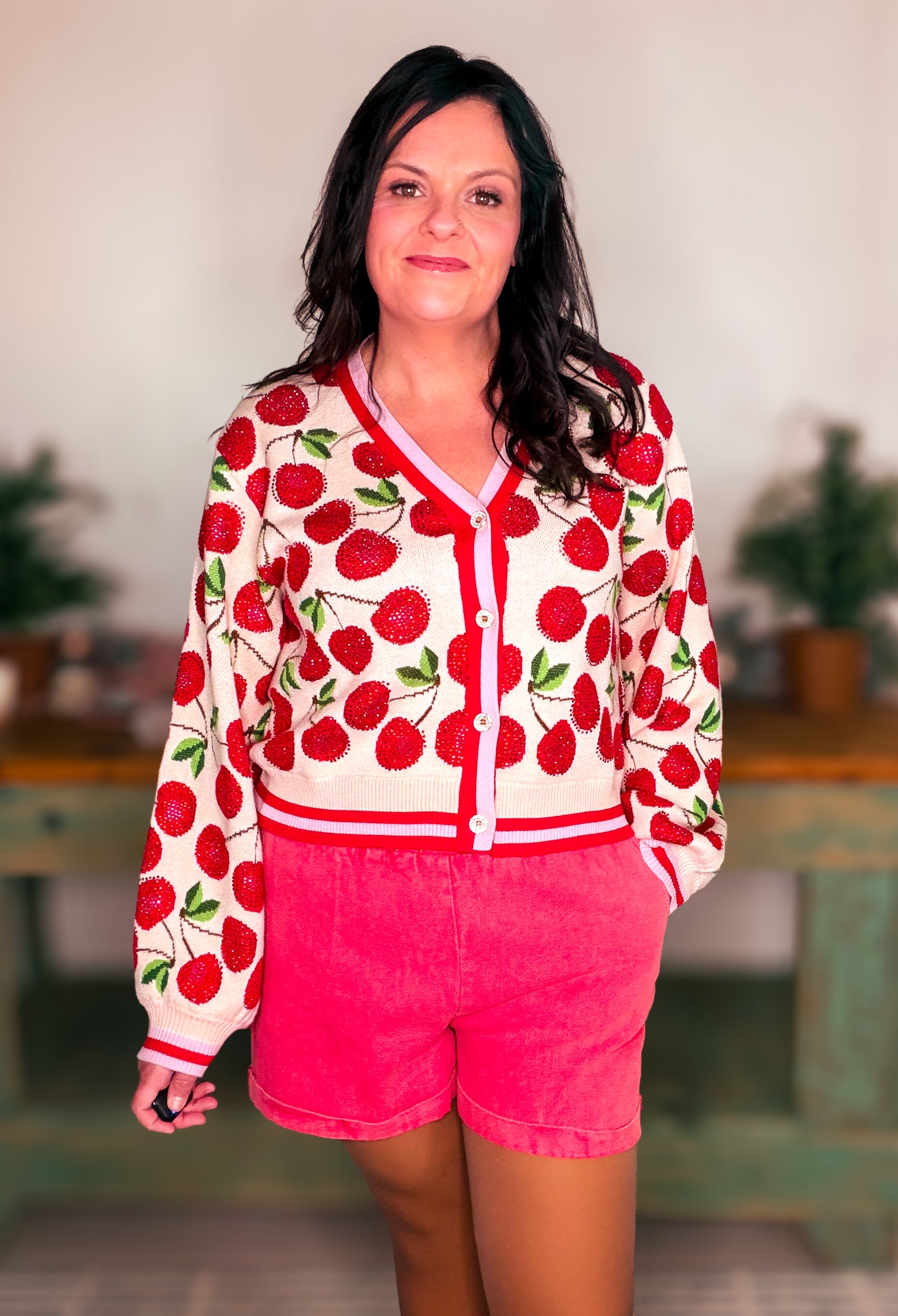 This cardigan is the ultimate mix of cute and glam. Whether you’re dressing it up with denim and heels or keeping it casual with sneakers, the Pale Pink Cherry Cardigan adds effortless charm and sparkle to any outfit.