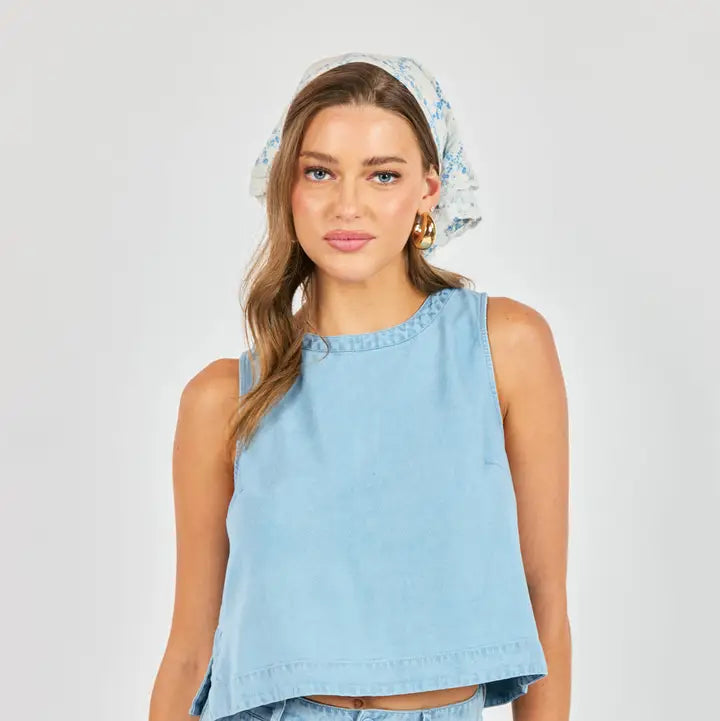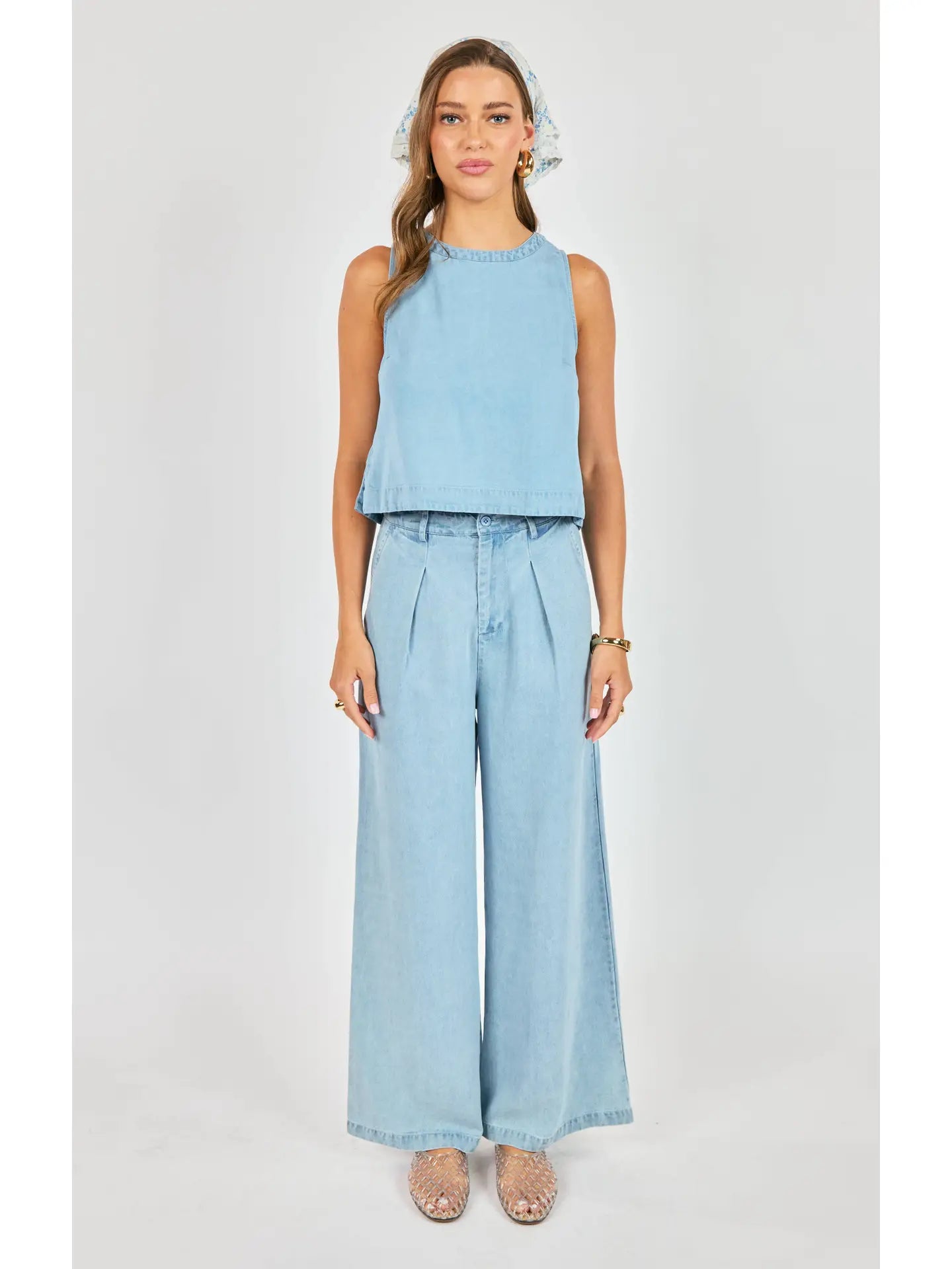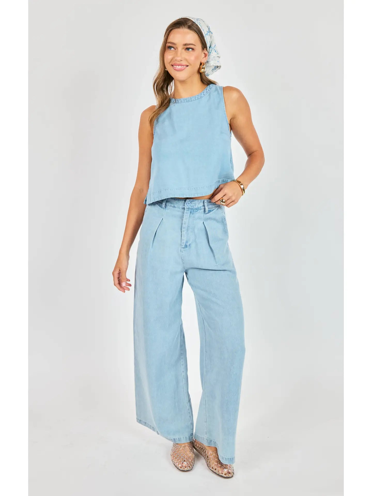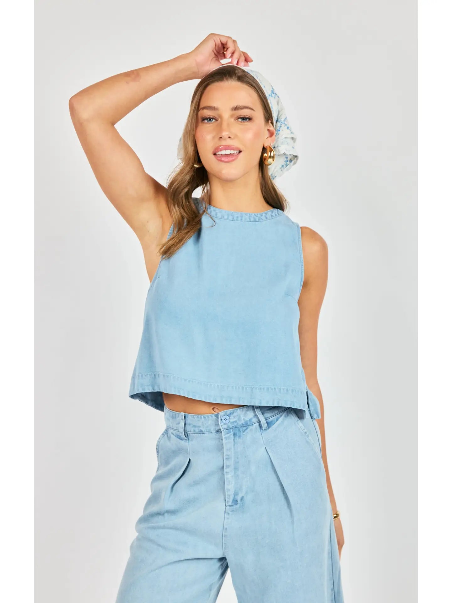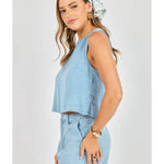 The Sadie & Sage It’s Pouring Sleeveless Chambray Crop Top is the perfect blend of effortless style and modern denim-inspired charm. Designed in a soft light chambray fabric, this sleeveless cropped silhouette features a clean high neckline and relaxed drape for a polished yet easy everyday look.