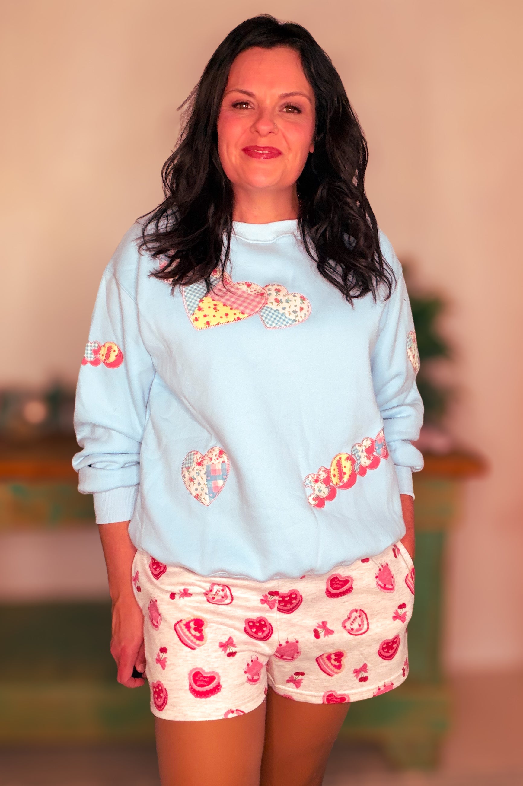 Add a playful touch to your loungewear with the Valentines Cake Printed French Terry Sweat Shorts. Made from soft, cozy French terry fabric, these sweat shorts feature an adorable cherry and cake print, making them perfect for casual days at home or running errands in style.