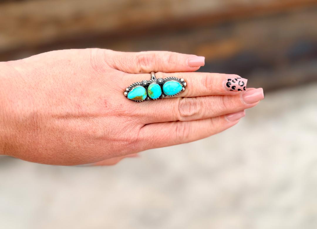 Elevate your collection with this 3-Stone Sonoran Gold Ring, featuring three stunning stones set in a bold, artisan design. Hand-signed by Obert Hakey, this piece showcases expert craftsmanship and timeless southwestern elegance. Perfect for making a statement on any occasion, this ring is a must-have for collectors and lovers of unique jewelry.