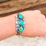 Add a bold touch with this 3-Stone Sonoran Turquoise Bracelet, featuring three vibrant turquoise stones set in a classic artisan-crafted sterling band. Marked JJJ, this bracelet showcases expert craftsmanship and timeless style. Perfect for layering or wearing alone as a statement piece.