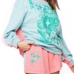 Turn heads in the Queen of Sparkles Aqua & Pink Cotton Colorblock Logo Card Sweatshirt! This standout piece features a bold aqua front with soft pink colorblock accents and a fully pink back for the sweetest unexpected pop of color. The signature QOS logo card graphic is finished in intricate sparkle embellishment for that unmistakable Queen energy!