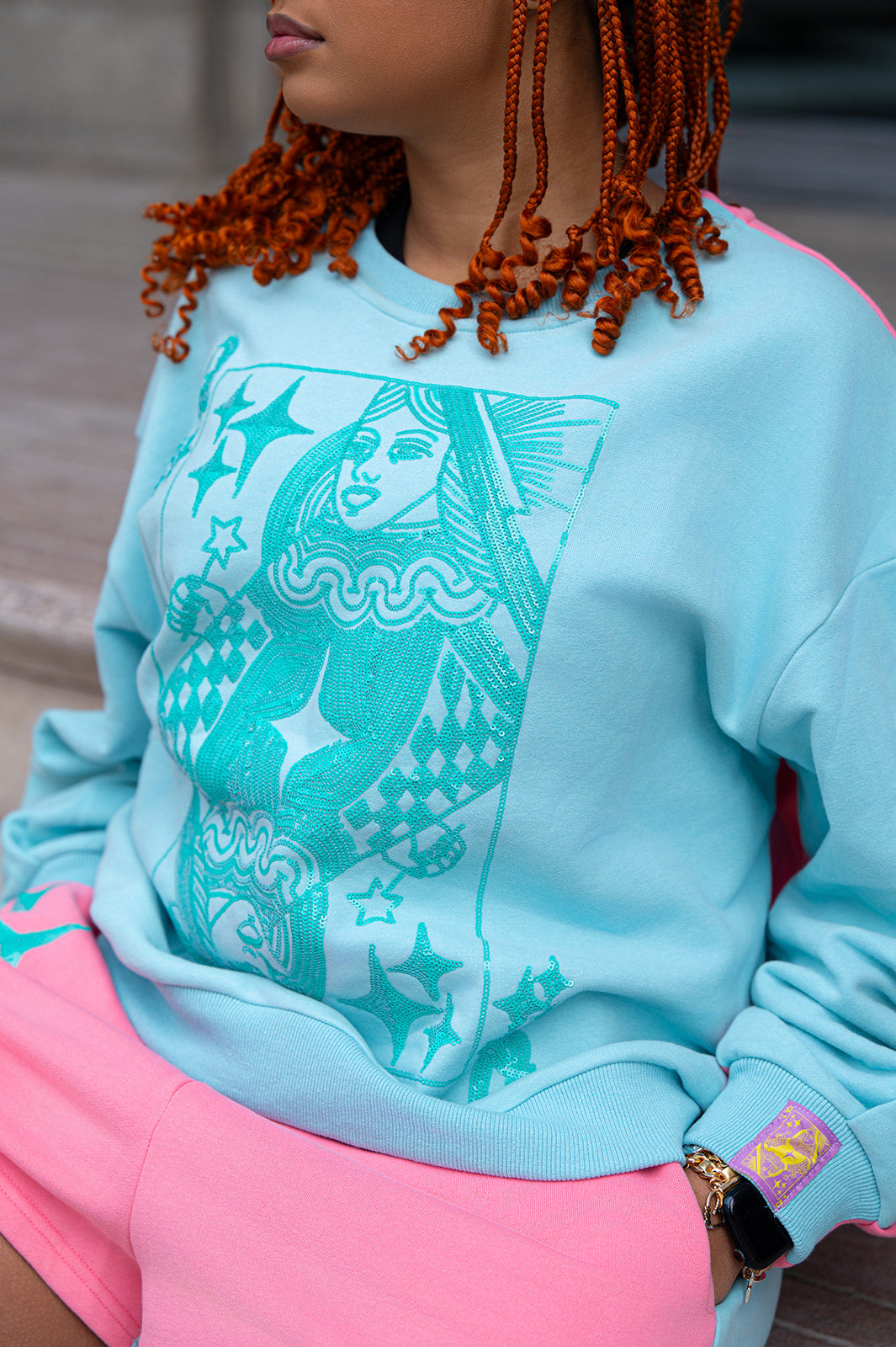 Turn heads in the Queen of Sparkles Aqua & Pink Cotton Colorblock Logo Card Sweatshirt! This standout piece features a bold aqua front with soft pink colorblock accents and a fully pink back for the sweetest unexpected pop of color. The signature QOS logo card graphic is finished in intricate sparkle embellishment for that unmistakable Queen energy!