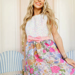 The Audrey Floral Dress by Brianna Cannon is a romantic statement piece designed to turn heads. Featuring a beautifully textured floral brocade skirt in vibrant pinks, blues, and golds, this dress blends classic femininity with playful charm!