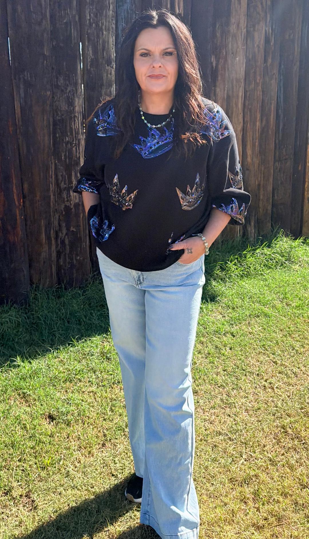 Make a royal statement with the Limited Edition Black Crown Sweatshirt from Queen of Sparkles. Designed for the woman who loves to shine, this stunning piece features intricate sequin crown embellishments that sparkle against the rich black backdrop. Crafted in the brand’s signature soft, high-quality fabric, it combines cozy comfort with standout style. Perfect for dressing up your casual looks or adding a touch of glam to your everyday wear — this limited-edition piece won’t be here for long!