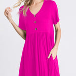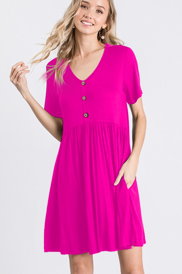 The Fuchsia V Neck Babydoll Pocket Dress brings a fun pop of color to your everyday wardrobe. Made in a soft rayon blend fabric, this dress features a flattering V neckline and decorative front button detail for a simple yet polished look.