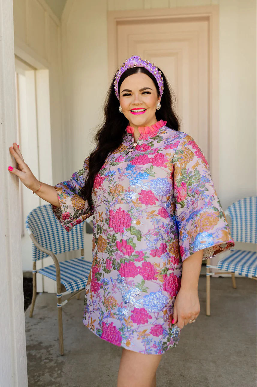 The Garden Party Caftan Dress by Brianna Cannon is a statement-making silhouette designed for spring celebrations and special occasions. Featuring a vibrant floral brocade in shades of pink, lavender, blue, and gold, this dress delivers rich texture and dimensional shine.