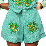 Turn heads and bring the luck with the Green Gingham Ruffle Jeweled Shamrock Shorts by Queen of Sparkles. These statement shorts feature a classic green gingham print, flirty ruffle details, and a dazzling jeweled shamrock that adds the perfect touch of sparkle.