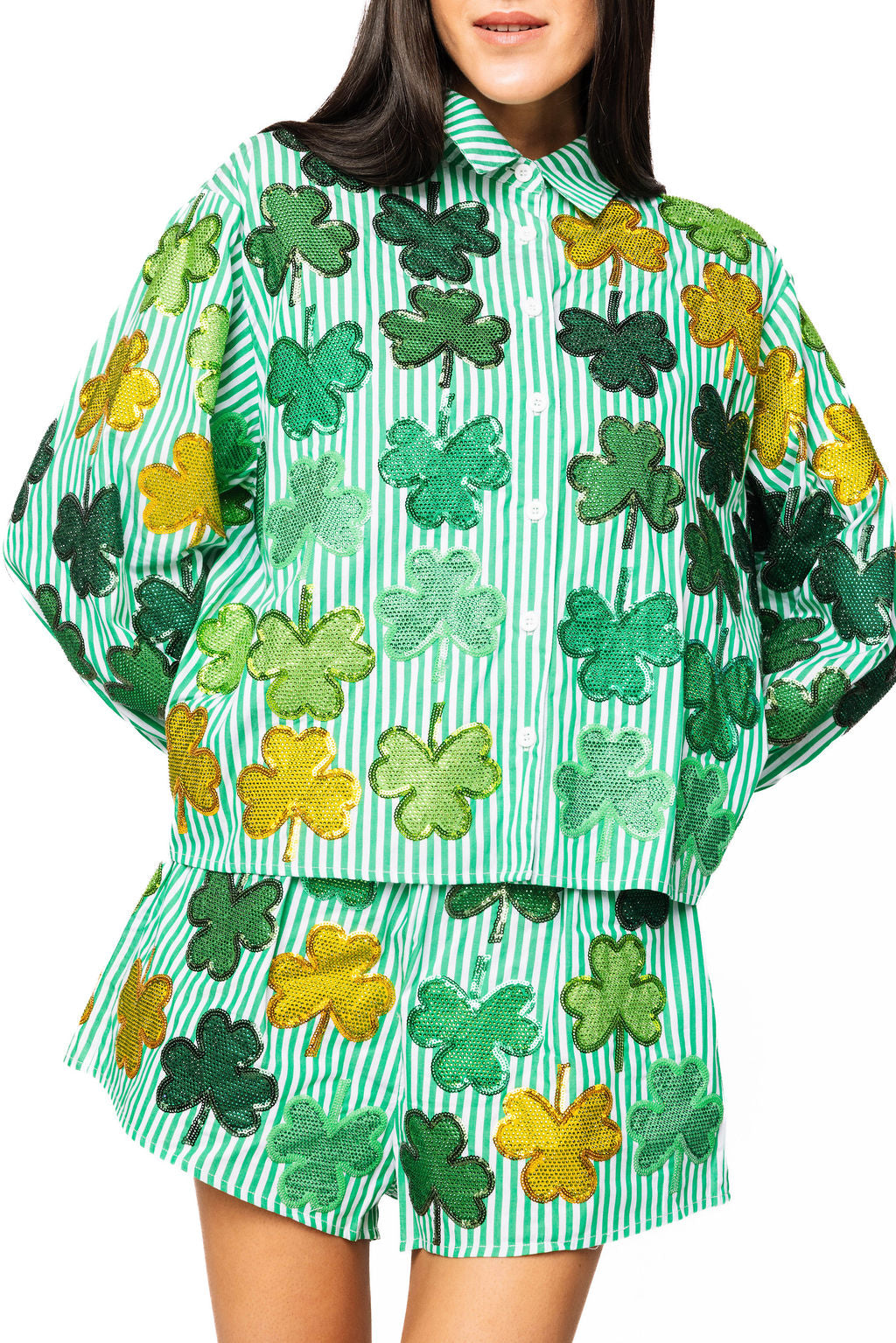 Designed with a button-up front and long sleeves, it’s perfect for layering or wearing solo. Style it with jeans for a casual-chic look or pair it with Queen of Sparkles shorts or skirts for a standout St. Patrick’s Day outfit. Fun, fashionable, and effortlessly luxe—this is festive dressing done right.