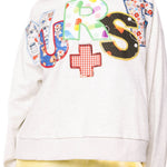 • Grey sweatshirt with “Nurse” multi-fabric lettering