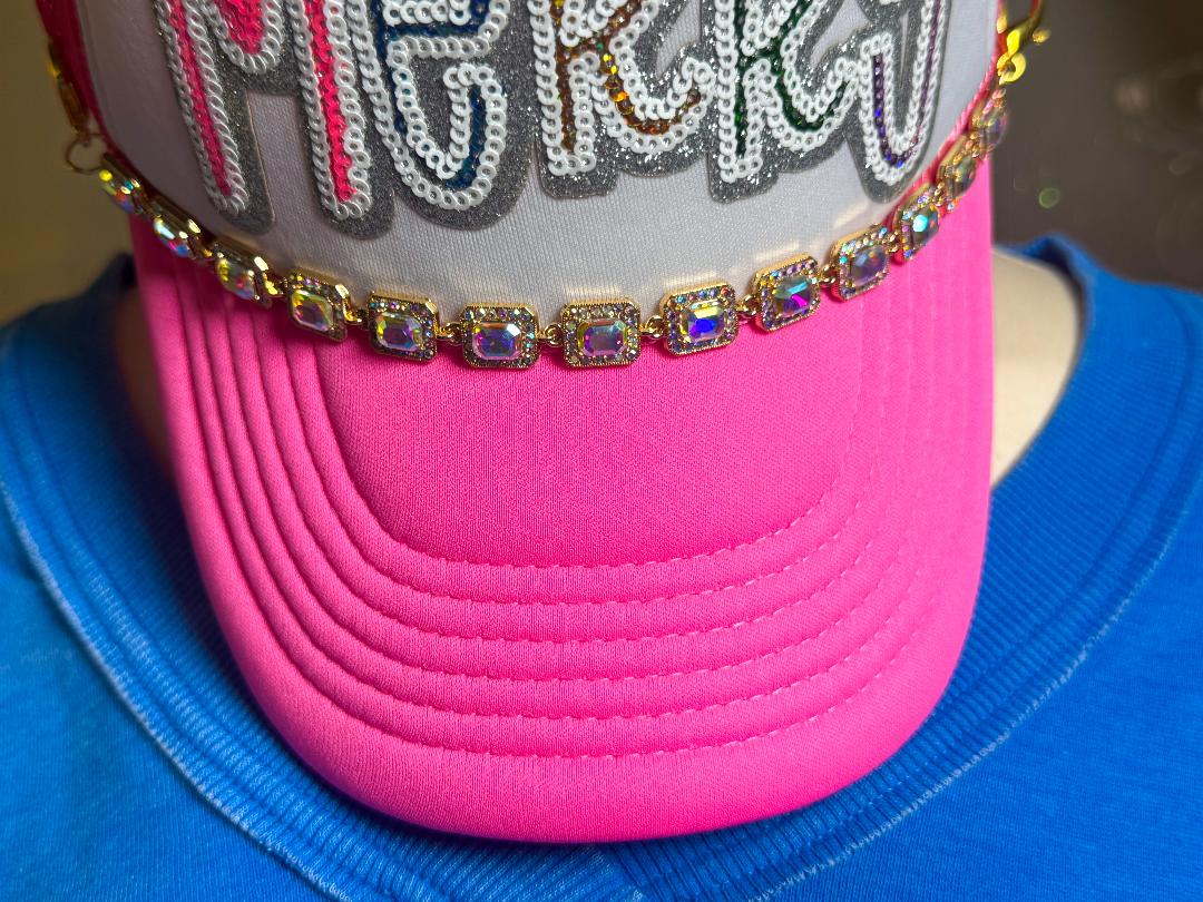 This jumbo AB rhinestone trucker chain is one of our favorites! Add the perfect over the top touch to all your favorite trucker hats with this silver & AB rhinestone trucker hat chain. CHAIN ONLY. Silver and Gold Option