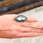 Make a statement with this Large One-Stone White Buffalo Ring, featuring a stunning White Buffalo stone set in a bold, artisan design. Hand-signed by Jimmy Lee, this adjustable ring combines timeless southwestern style with expert craftsmanship. Perfect for collectors or anyone looking for a standout piece.