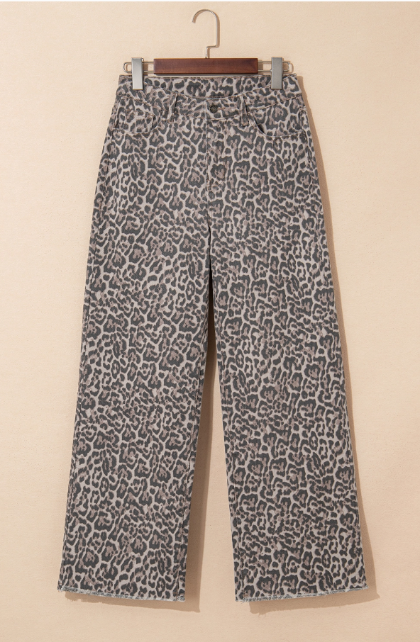 Meet your new statement denim! Our Leopard Frayed Edge Wide Leg High Waist Jeans in brown blend bold vibes with a chic, modern silhouette. The high-rise fit smooths and flatters, while the wide leg and frayed hems bring effortless movement and personality. Finished in a neutral brown leopard print, these jeans instantly elevate any look—from graphic tees to cozy sweaters and boots.