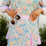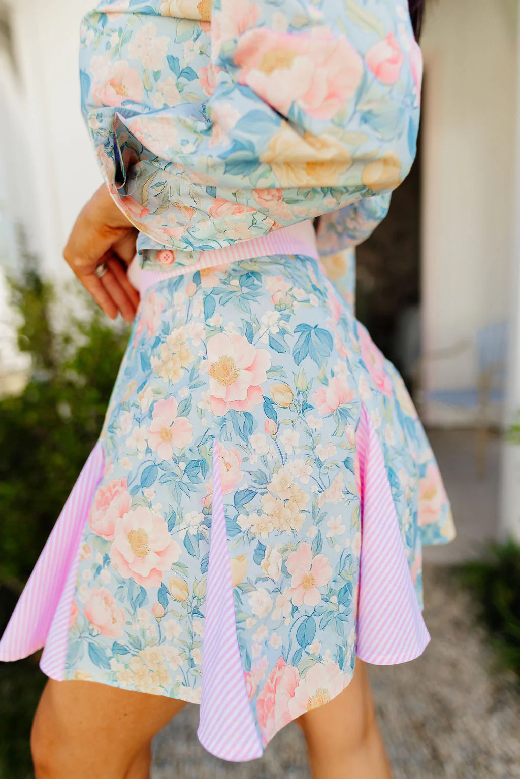 The Preppy Floral Pleated Skort by Brianna Cannon blends feminine florals with playful preppy detail. Featuring a soft blue floral print accented with pink and cream blooms, this standout piece is finished with contrast striped pleated panels for added movement and charm.