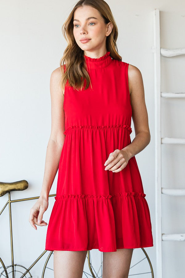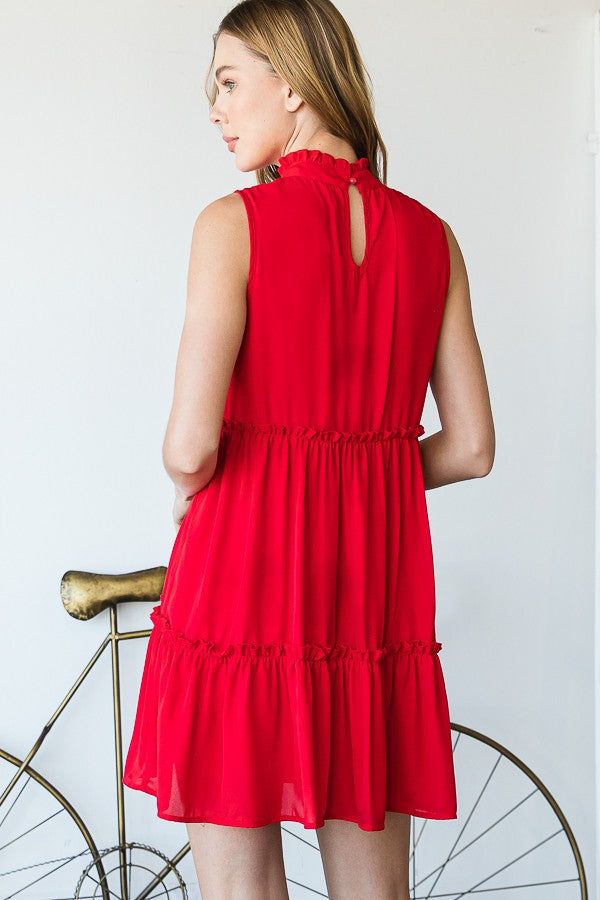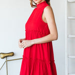 The Red Mock Neck Ruffle Tiered Dress brings bold color and feminine movement together in the perfect statement piece. Designed in a lightweight flowy fabric, this sleeveless dress features a delicate mock neckline and soft ruffle tier details that create effortless movement.