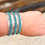 Show off your southwestern style with this Zuni Snake Eye 3-Row Cuff, featuring intricate inlay work in a bold, three-row design. Hand-signed by JP Ukestine, this artisan piece highlights expert craftsmanship and timeless Zuni jewelry traditions. Perfect as a statement piece or for layering with other cuffs.